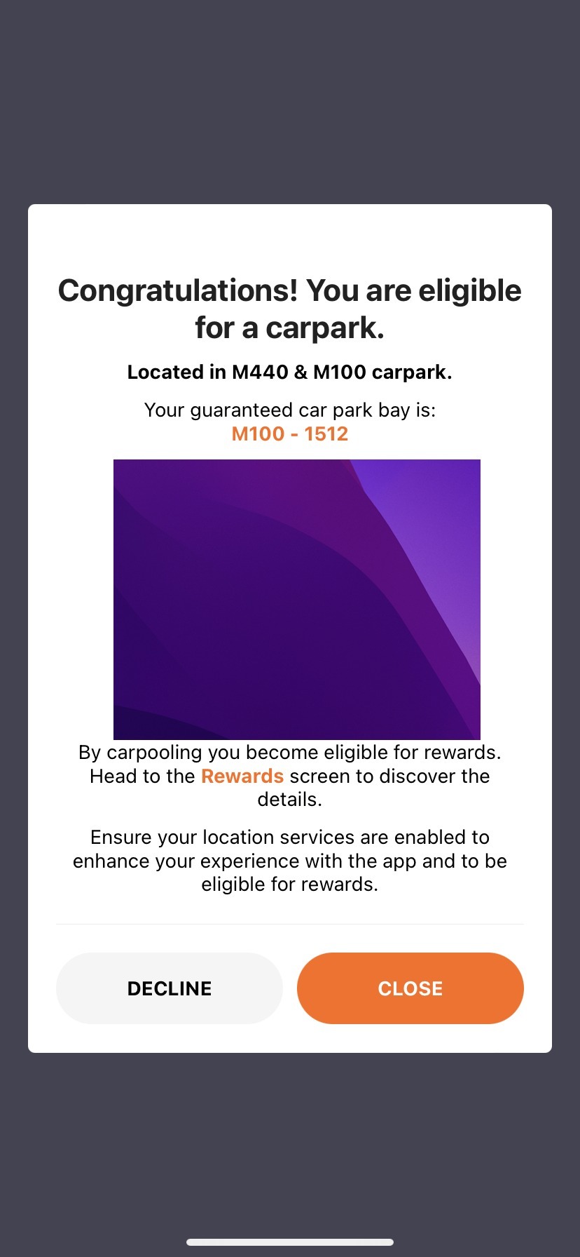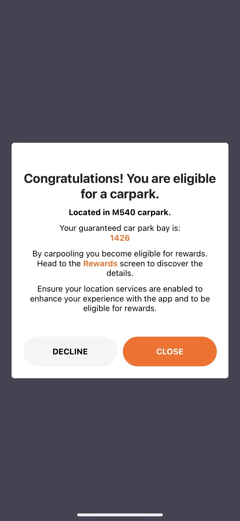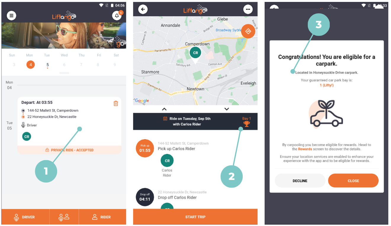 The confirmation of getting a successful carpool does not necessarily mean you have managed to get a car park. Follow the instructions above to review the ride in detail to see if you have a trophy and select the trophy to find out which carpark and potentially bay you have been assigned.