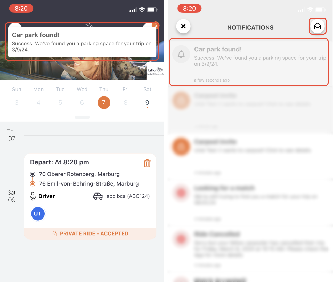 Upon accepting a ride as a driver, there will be a notification saying that you have been assigned to a parking space. Selecting this notification will open the ride's detailed view.