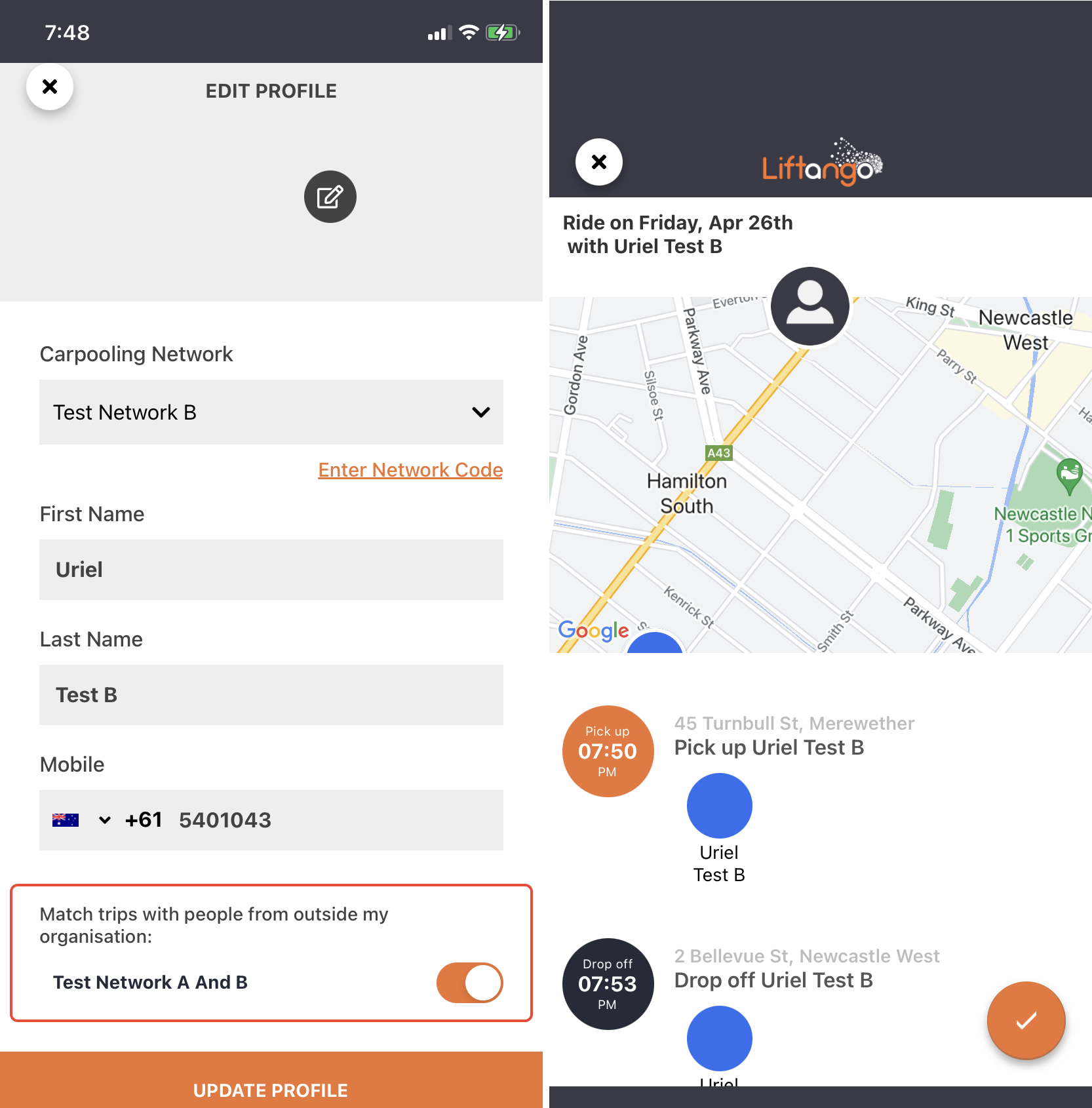In this example, Uriel Test A is under Test Network A while Uriel Test B is under Test Network B. Ticking the box would allow both users to match a public ride.
