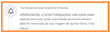 Para uma viagem que já tenha sido associada a uma autorização de estacionamento, é possível que o proprietário da autorização cancele a viagem. Quando isso acontecer, o motorista será notificado de que a autorização de estacionamento foi removida para a viagem associada.