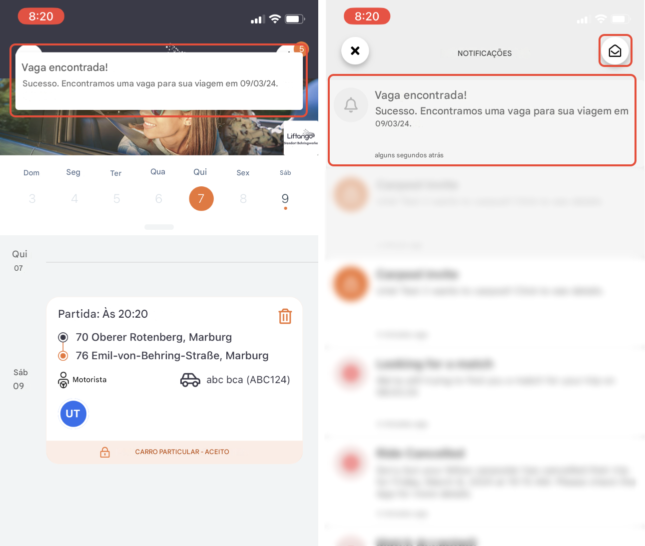 Ao aceitar uma viagem como motorista, você receberá uma notificação informando que foi alocado a uma vaga de estacionamento. Selecionar essa notificação abrirá a visualização detalhada da viagem.