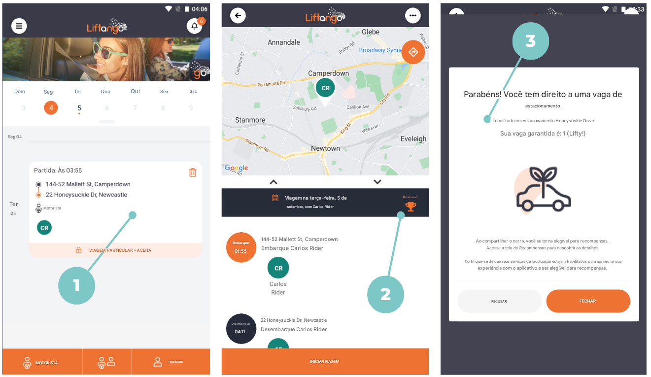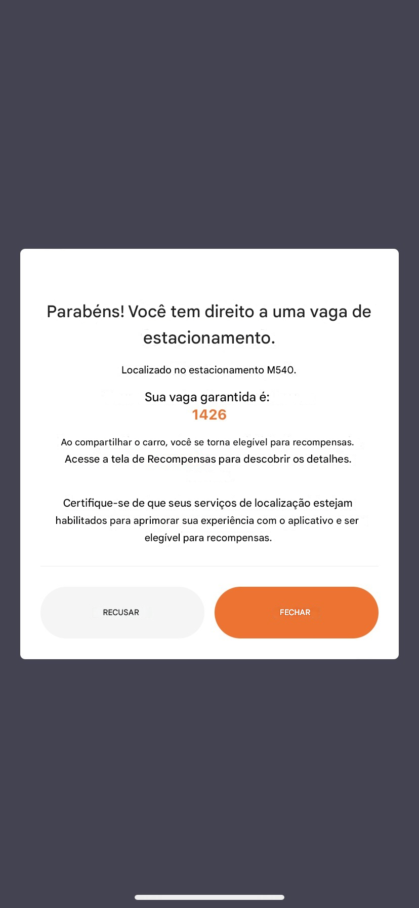 Observações: As notificações de localização do estacionamento são enviadas exclusivamente aos motoristas para sua conveniência. Sua organização pode incluir uma imagem na tela pop-out para referência visual adicional sobre o estacionamento. Por exemplo, pode ser a imagem da entrada do estacionamento ou o PIN da cancela. Os passageiros também podem visualizar os detalhes do estacionamento selecionando o ícone de troféu no aplicativo.