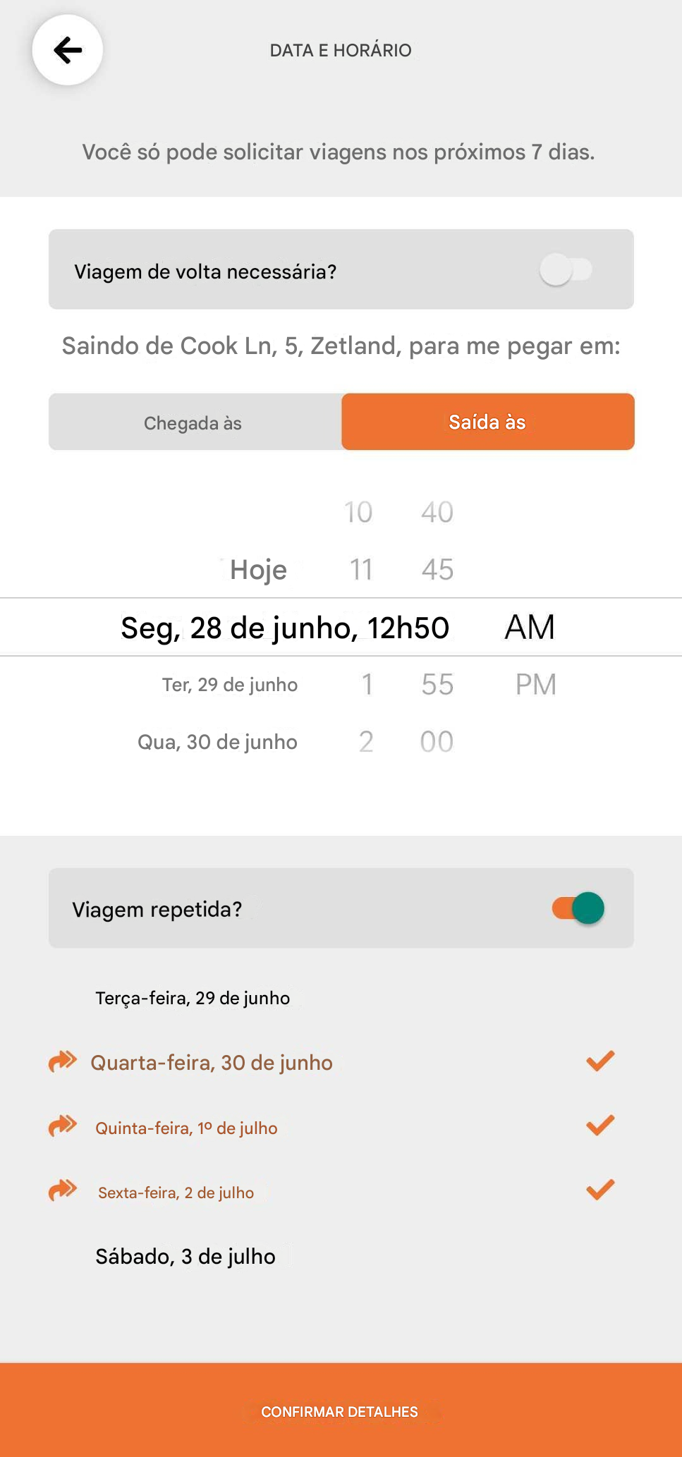 Reservas recorrentes podem ser feitas com até 7 dias de antecedência por meio do recurso Repetir Viagem, que permite aos passageiros repetir a viagem e selecionar a data em que desejam repeti-la.