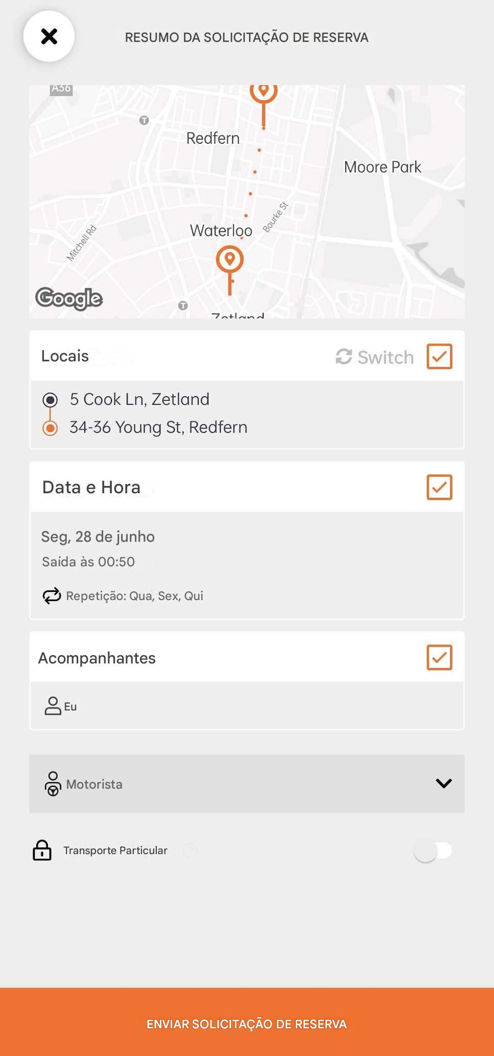 - No resumo da solicitação de reserva, preencha os detalhes de "Locais" inserindo o endereço de chegada/partida. Clique na seção "Data e Hora" .