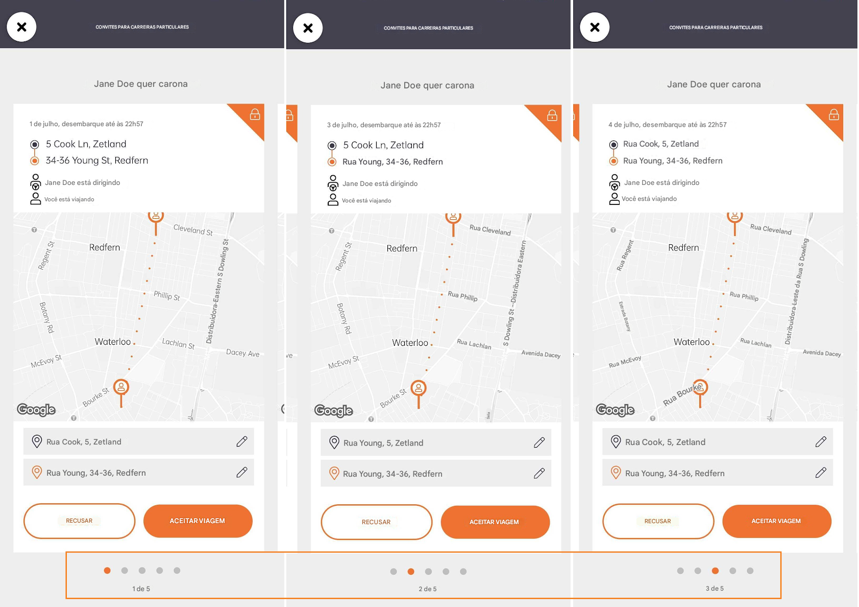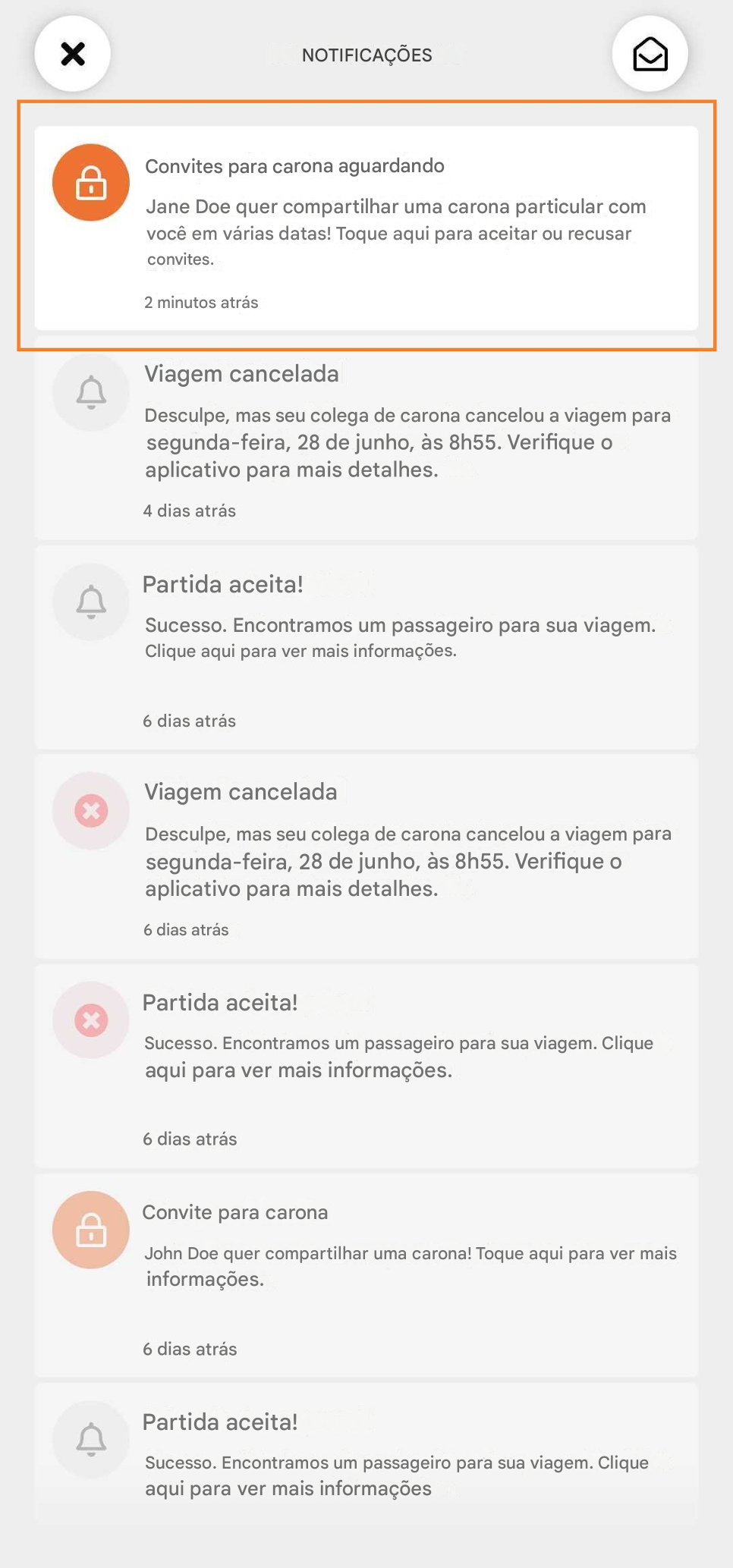 - O convidado receberá uma notificação de convite para carona. 2. Os detalhes da viagem repetida serão exibidos na tela. O convidado pode deslizar para conferir os convites recebidos e escolher quais aceitar e recusar.