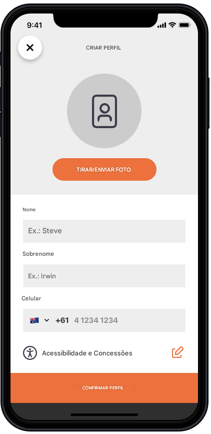 - Após a verificação do e-mail, o usuário será solicitado a inserir detalhes como nome, sobrenome e número de celular, além de tirar/carregar sua foto.