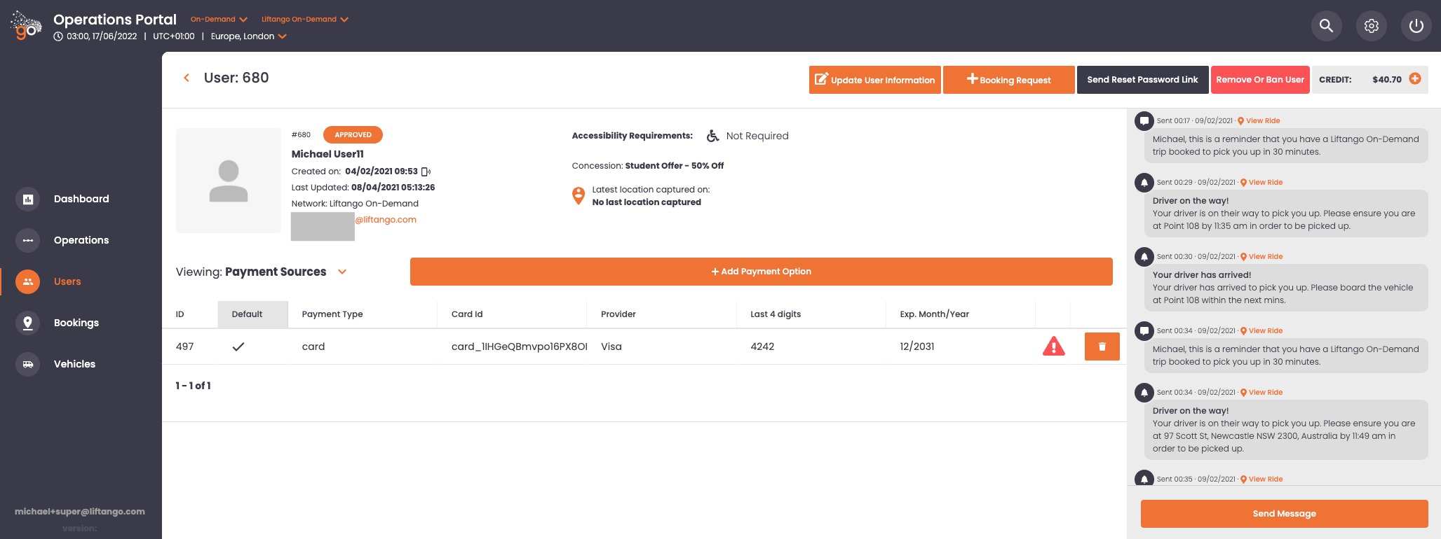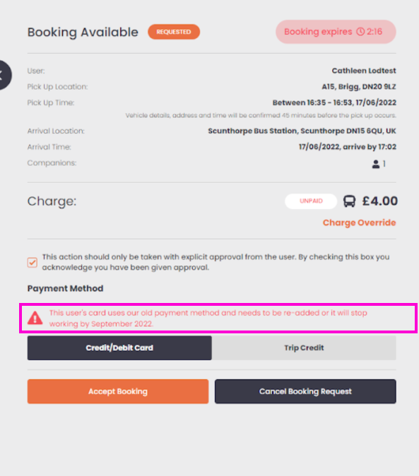 Todos os cartões adicionados a perfis novos ou existentes serão processados pelo novo sistema. Para aqueles que ainda não utilizaram o novo serviço, será exibida uma mensagem no portal de operações, no perfil do usuário, bem como a confirmação da solicitação de reserva, conforme mostrado abaixo.
