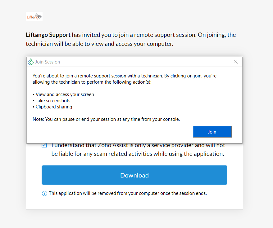 A sessão de suporte remoto será iniciada pelo técnico. O técnico poderá fornecer o link diretamente ou por e-mail. Se enviado por e-mail, veja como ficaria: