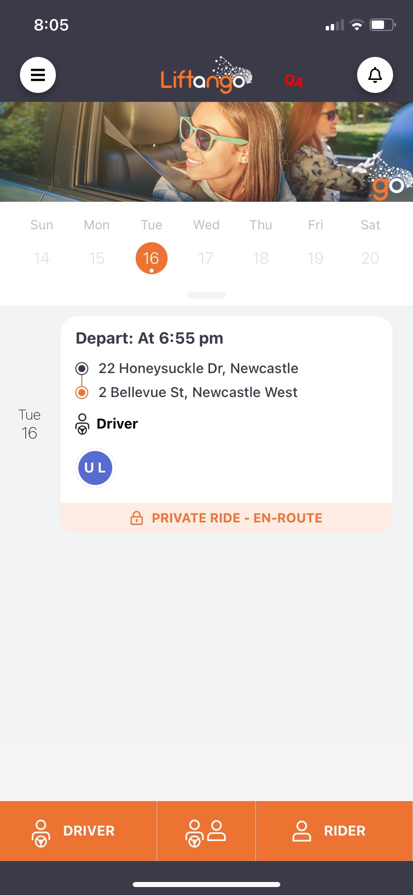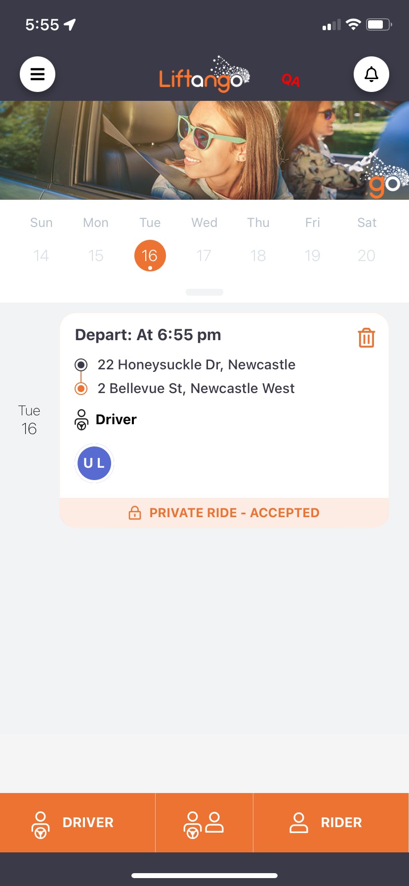 Aqui, podemos ver que são 17h55 (exatamente 1 hora do horário da viagem) e que podemos iniciar a viagem.