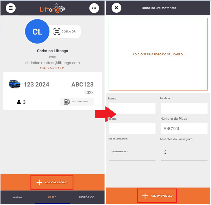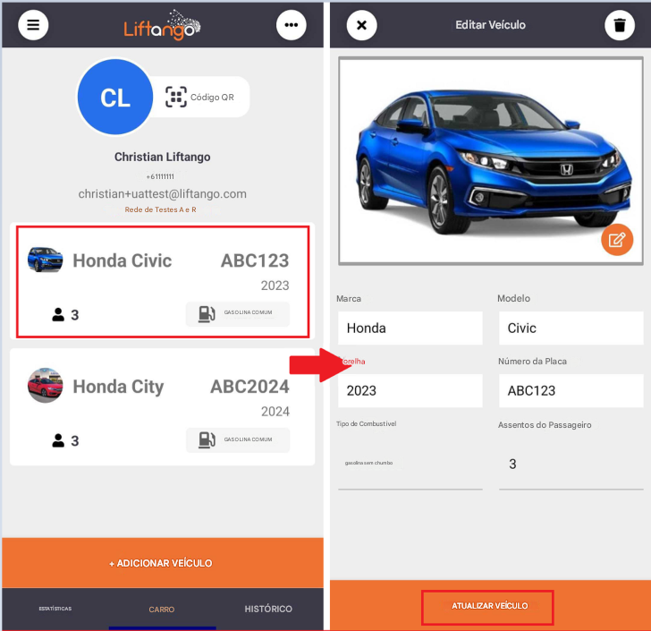 Para atualizar um veículo existente, vá para a aba do carro no perfil, conforme descrito acima