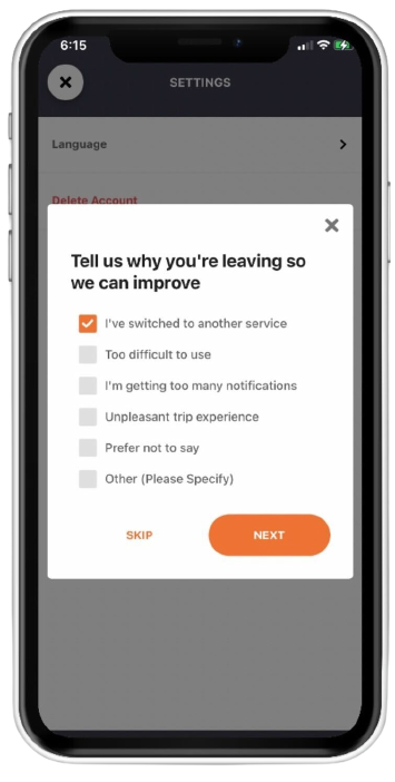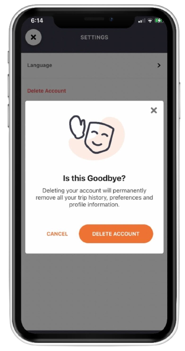 Be mindful of the account deletion to be done as your account will be removed upon confirmation. Your trip history, preferences and profile information will not be recovered once removed.